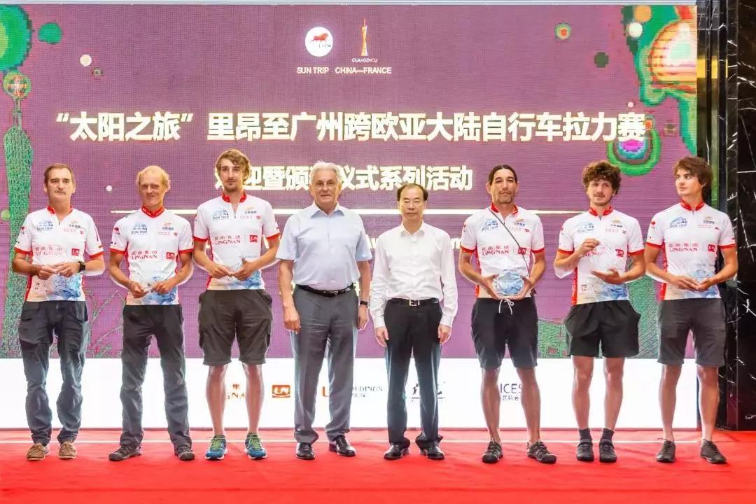 8月30日,2018年中法“一带一路:太阳之旅”自行车拉力赛成功完赛的选手代表参加了在东方宾馆举行的“太阳之旅”欢迎暨颁奖仪式。广州市委常委、秘书长潘建国,大里昂副主席阿兰·加里亚诺,广州市委宣传部副部长朱小燚,太阳之旅首席执行官弗洛里安·贝利,岭南集团董事长冯劲等出席了活动。中法两国友人齐聚一堂,就环保、艺术、旅游、体育等多个领域的话题,举行了一场别开生面的中法友好交流广州故事会。